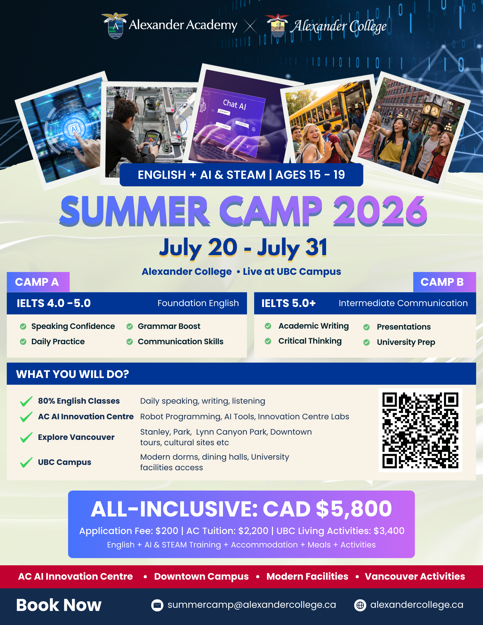 The Alexander Academy–Alexander College Summer Camp 2026 is a two-week academic and cultural immersion program in Vancouver for students aged 15–19. The camp combines English language development with hands-on AI & STEAM learning, giving students exposure to emerging technologies while strengthening communication and academic skills.