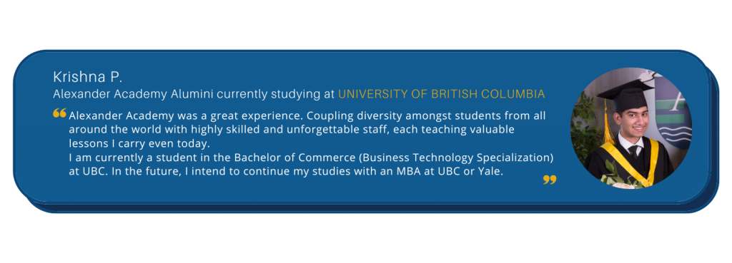 At Alexander Academy, we strive for excellence, both in academics and personality. Our international diverse community, consisting of over 30 countries, makes us unique and the most sought-after private high school in Downtown Vancouver. We are dedicated to fostering compassion, open mindedness, competency and all-round development for our young graduates, who will set out to leave their impactful mark on the world.